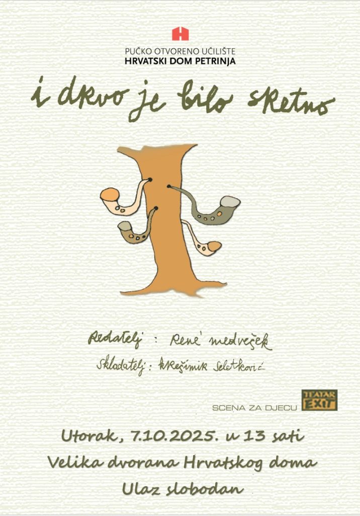 Povodom obilježavanja Dječjeg tjedna u Petrinji, pozivamo Vas na kazališnu predstavu za djecu Teatra Exit “I drvo je bilo sretno” 7.10.2025. u 13 sati, velika dvorana Hrvatskog doma Ulaz je slobodan