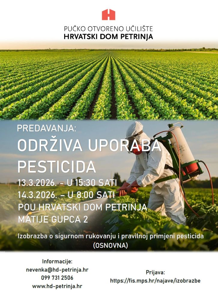 Predavanje iz osnovne izobrazbe profesionalnih korisnika o sigurnom rukovanju i pravilnoj primjeni pesticida je 13. ožujka u 15:30 sati i 14. ožujka u 8:00 sati, Matije Gupca 2, 44250 Petrinja.