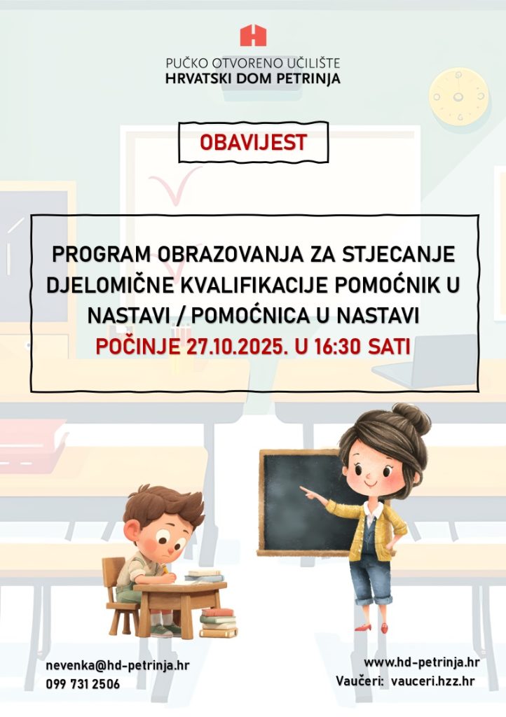 OBAVIJEST Program obrazovanja za stjecanje djelomične kvalifikacije pomoćnik u nastavi / pomoćnica u nastavi počinje 27.10.2025. u 16:30 sati