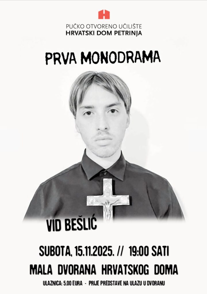 POU Hrvatski dom Petrinja Vas poziva na kazališnu predstavu Vid Bešlić – “Prva monodrama” Subota, 15.11.2025. u 19:00 sati Mala dvorana Hrvatskog doma Cijena ulaznice: 5,00 EURA Prodaja ulaznica prije predstave na ulazu u dvoranu